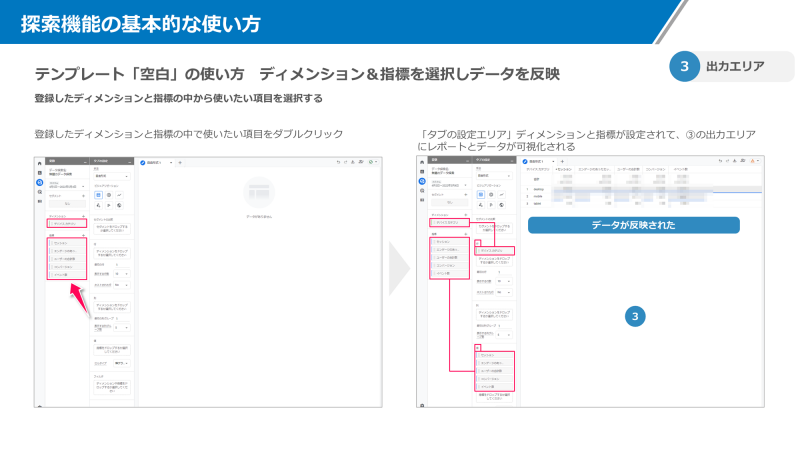 今、登録したディメンションと指標の中から、使いたい項目をダブルクリックして選択します。すると、「出力」エリアのレポートに反映されます。