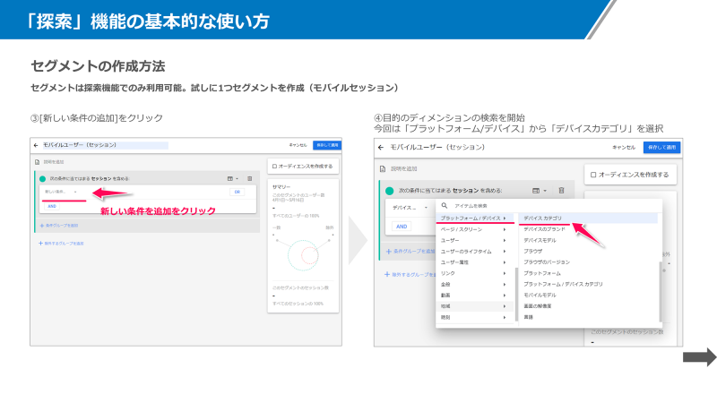 ディメンションや指標が出てきますのでセグメントをかけたい条件を設定します。今回はモバイルから来たユーザーでセグメントをかけたいとします。その場合は、「プラットフォーム/デバイス」の「デバイスカテゴリ」を選択します。
