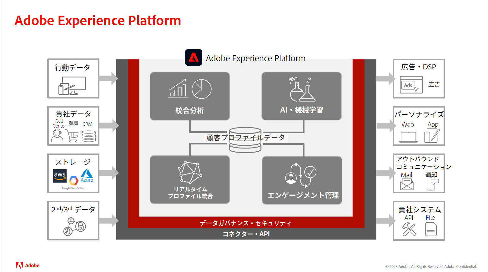 Adobe Experience Platformでは、企業が運営する多様なチャネルから取得できるデータを収集し、顧客プロファイルを管理するだけでなく、一意の顧客情報として他のAdobeソリューションと連携しデジタルマーケティングを実行します。