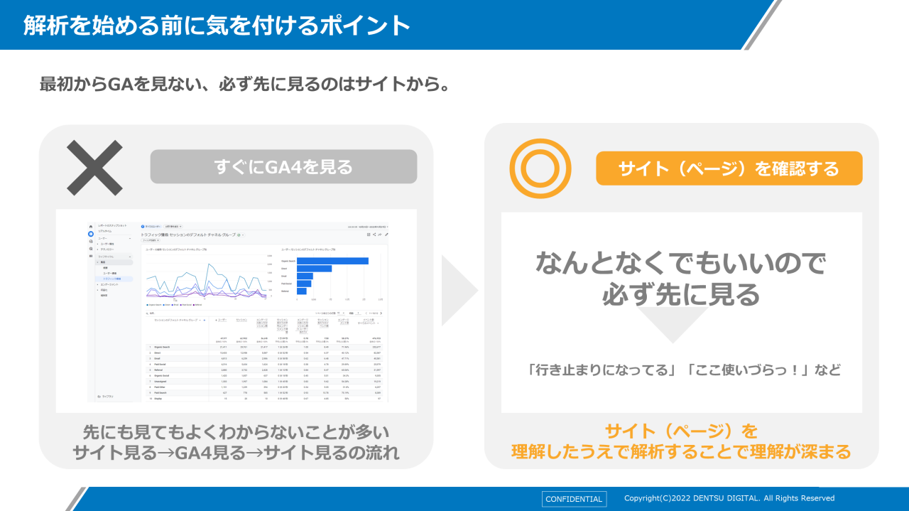 馬場 : 解析を始める前に気をつけるポイントがあります。「いきなりGA4を開いて見ない・先に見るのはWebサイト」です。