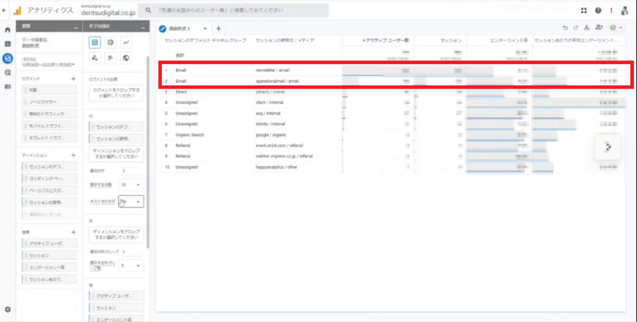 小川 : 「セッションのデフォルトチャネルグループ」にフィルターを適用して、LPへの流入の内訳を調べてみると、ほぼメールです。ただ、エンゲージメント率はメールが少し低めです。