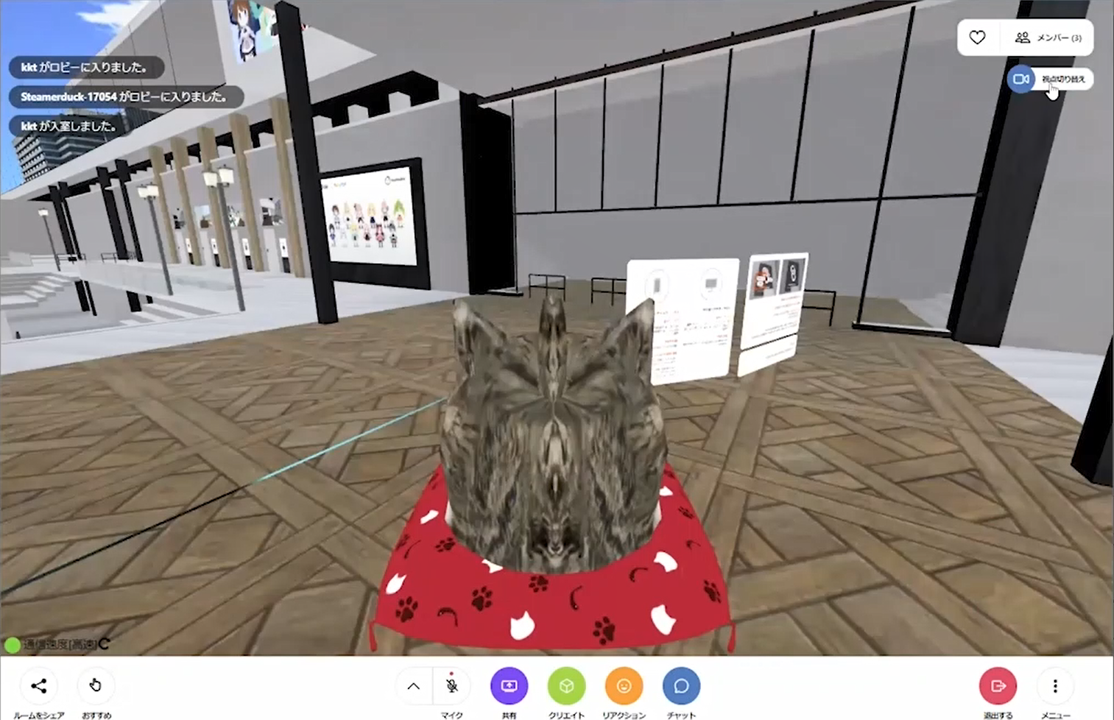 泰良 : 荻谷さんは、普段はXR制作会社の役員で、成人男性として生活されていますが、メタバースワールドの中では猫(Mr.にゃーん)になって、司会をしたりユーザーとして活動したりしています。猫になってみて気づいたことはありますか?