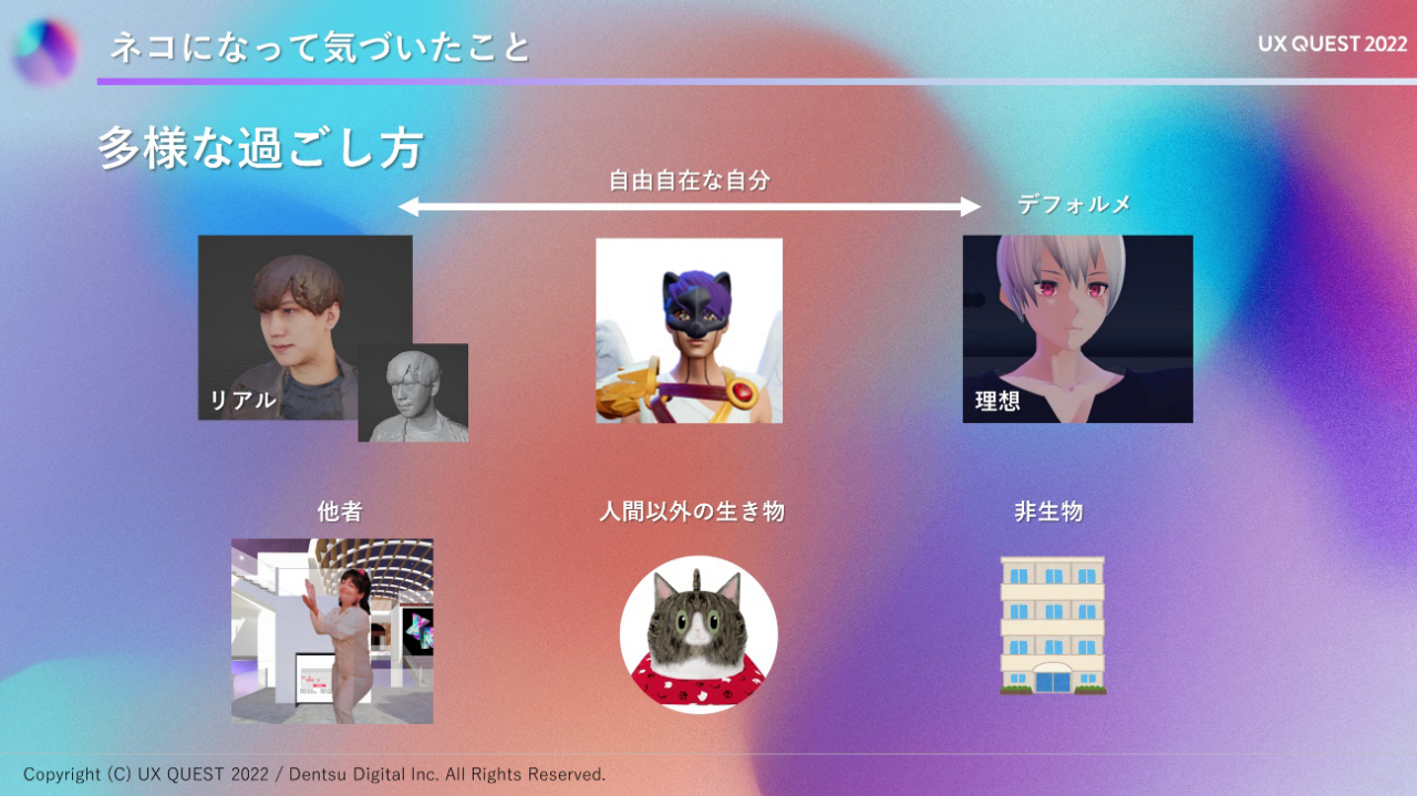 荻谷 : リアルに近い姿になりたい人もいれば、動物や非生物のような絶対になれないものになりたい人もいる。選択肢がたくさんあるのがメタバースです。そういうところを楽しんでいただきたいなと思います。