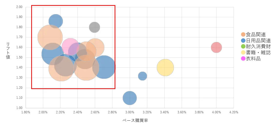 今回の事例ではもう一歩踏み込んで、「広告接触者は、他にどんな商品カテゴリに対して購買意向があるのか。その中でも広告効果が期待できそうな集団(次回施策における新たなターゲット群)はどれなのか」を可視化する検証を行いました。今回の商品の場合、日用品やカウンターフードの購買者に広告効果が見込めることがわかったので、次回施策のプランニングに活かす方向でご検討いただいています。