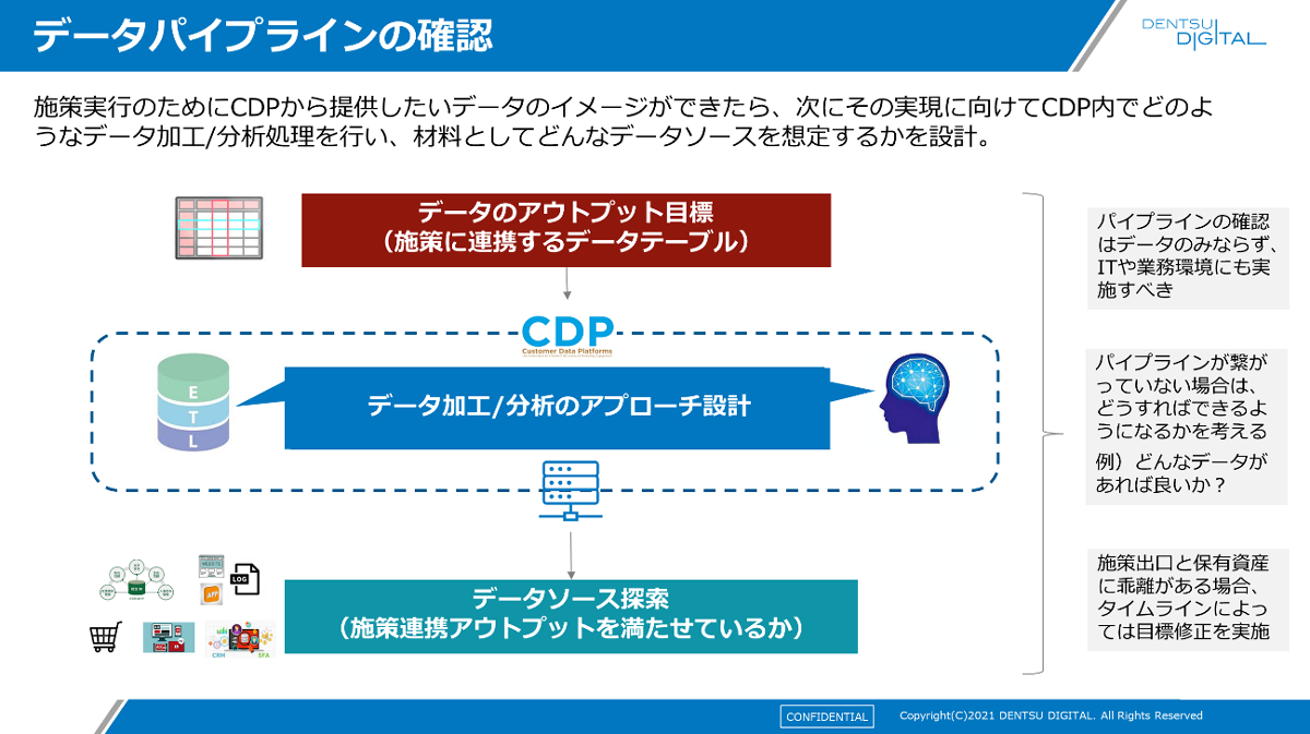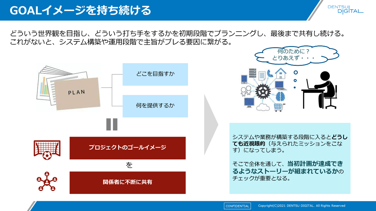 例えば、CDPの構築段階に入ってしまうと、担当するエンジニアは自分たちに見えている範囲で部分最適するしかありません。「当初計画が達成できるストーリーが組まれているか、全体を通してチェックし続ける」というのが、1つ目のポイントです。