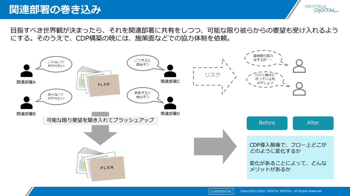 また、CDPの目的は、構築ではなく施策を行うことです。施策を実施する方々の協力がなければプロジェクトは完遂しません。ですから、彼らの要望を初期段階で可能な限り採り入れて、ブラッシュアップすることが大事です。「関連部署の巻き込み」を怠ると、関係者に当事者意識を持ってもらえず、「最低限のことをやっておけばいい」ということになってしまいがちです。これが2つ目のポイントです。