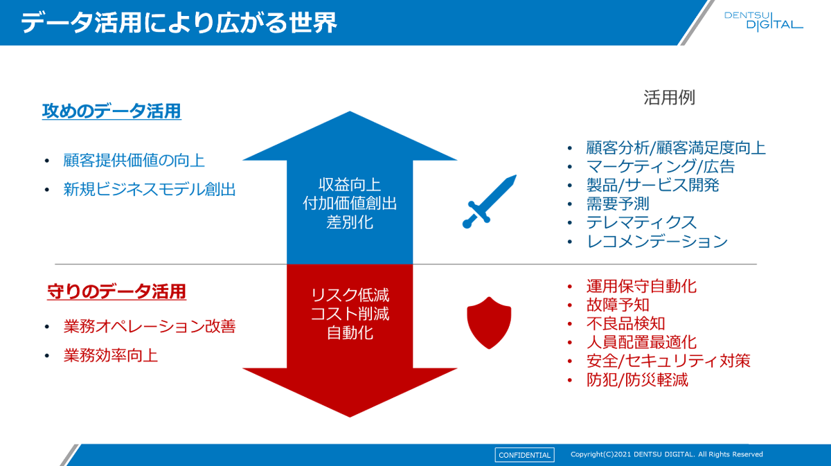 データ活用には、収益向上や付加価値創出などの「攻めの活用」と、リスク低減やコスト削減などの「守りの活用」があります。例えば、以下のような活用例があります。