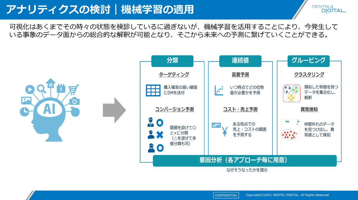CDPデータ活用では、アナリティクス(分析)によるデータ可視化が最もポピュラーな用途です。これは、KGI/KPIのロジックツリーを設計することから始めると、可視化のフォーカスや目的が明確になります。さらに、機械学習を活用すると以下の図のようなことが可能になります。このとき、一度作ったモデルをCDP側でアップデートするように仕組み化することが、失敗しないためのTipsになります。