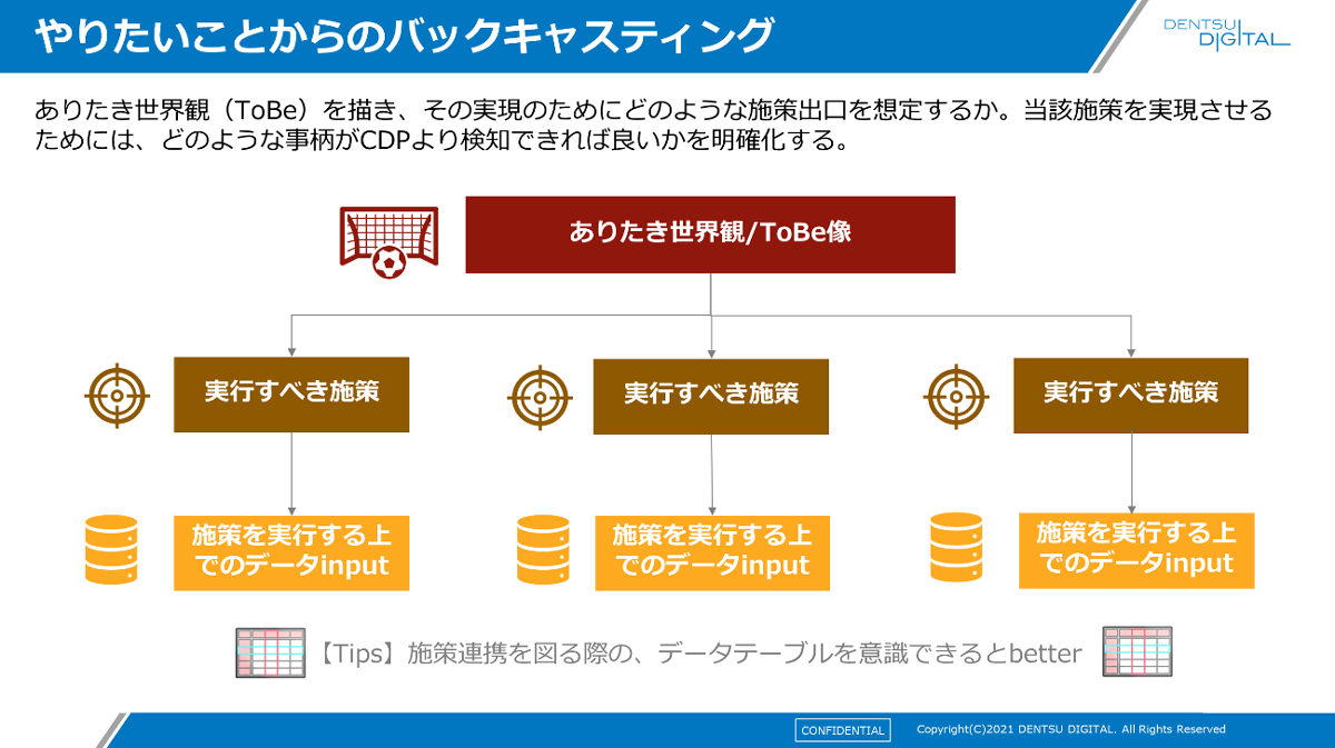 小西 : この場合は「ありたき世界/ToBe像」から考えると良いです。そこから遡って、それを実現するための施策を想定し、施策実現のためにCDPで何を検知すべきか明確にするという順です。