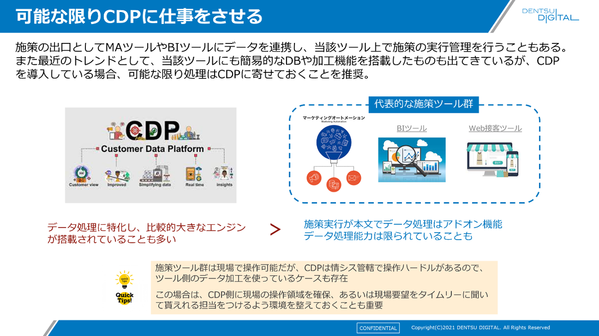 また、施策ツールが稼働しにくいという話がありました。最近のツールには簡易的なデータベースや加工機能を搭載したものもありますが、そのような処理はできるだけCDP側に寄せ、可能なかぎりCDPに仕事をさせると、施策ツールの負荷が減ります。そのためには、実際に施策ツールを操作する情シス部門などとのコミュニケーションが大事です。