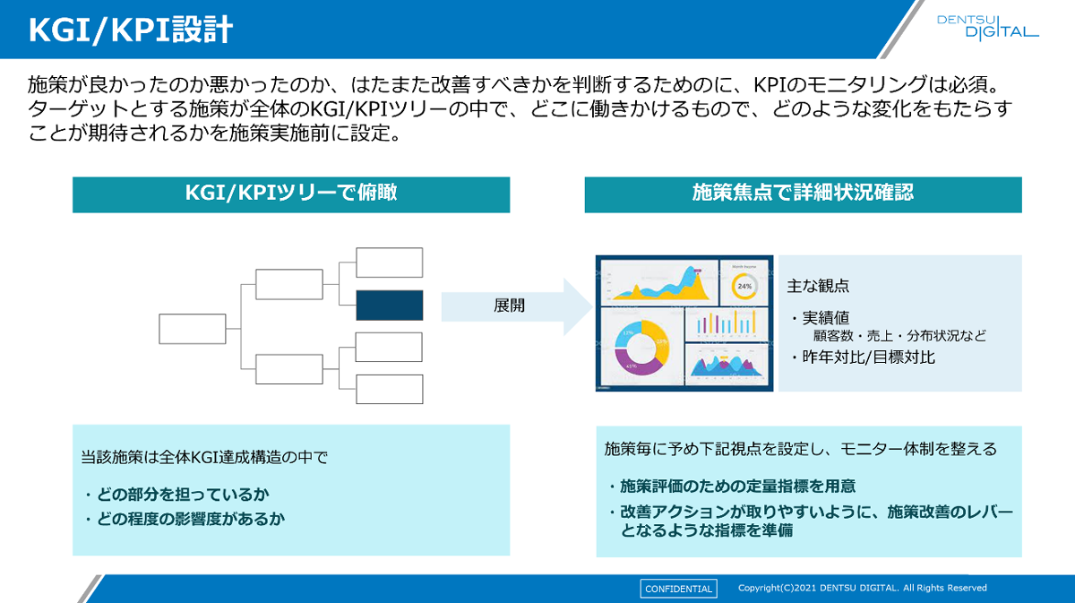 また、施策は一度実行して終わりではありません。PDCAを回し、施策の内容や精度を改善し続けることが必要です。そのためにはまずKGI/KPIツリーを設定しましょう。