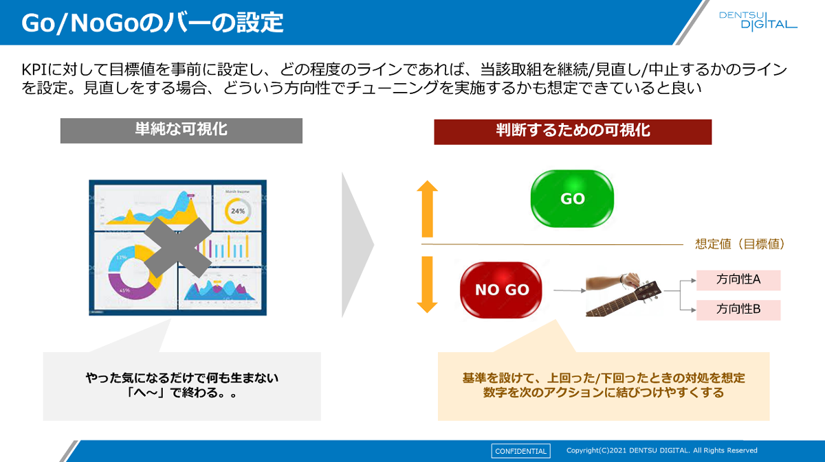 もう1つ、「Go/NoGoのバー」の設定も大事です。KPIをただモニタリングするだけではあまり意味がありません。モニタリングは判断するために行うもの。「この値を上回ったらGo」「下回っていたらNoGo」という、判断のための基準値がどうしても必要です。