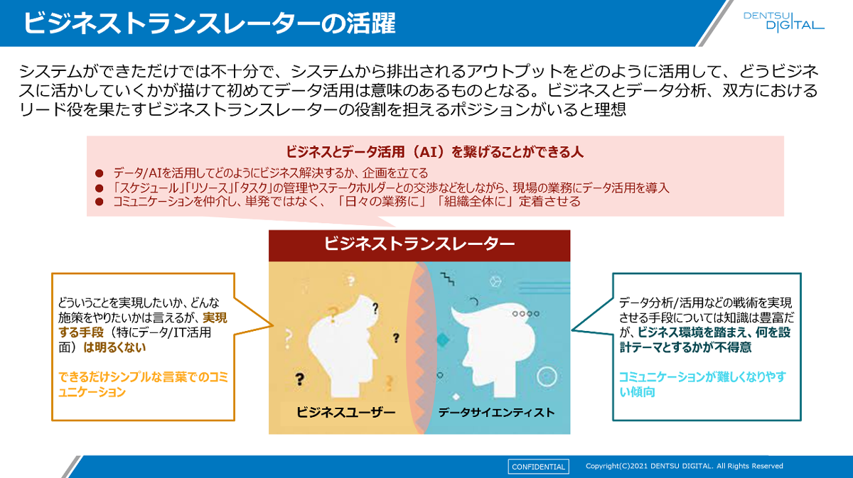 さらに、システムができただけでは不十分です。システムからのアウトプットをどう活用し、どうビジネスに活かすかを描かなければ意味がありません。そのような役割を担える人をビジネストランスレーターと呼びますが、そういう要素が必要になると思います。