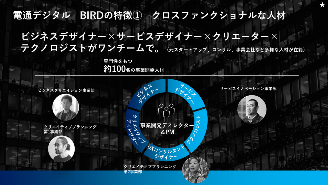 小浪 : 電通デジタルBIRDは、クロスファンクショナルな組織です。ビジネスコンサルタント、ビジネス/サービス/UXデザイナー、クリエイティブディレクター、ITコンサルタント、データサイエンティストなど、社内の複数の部門から、さまざまな専門性や知見をもった専門家を結集した1つのチームとして、企業の新規事業創造や事業変革に寄り添います。