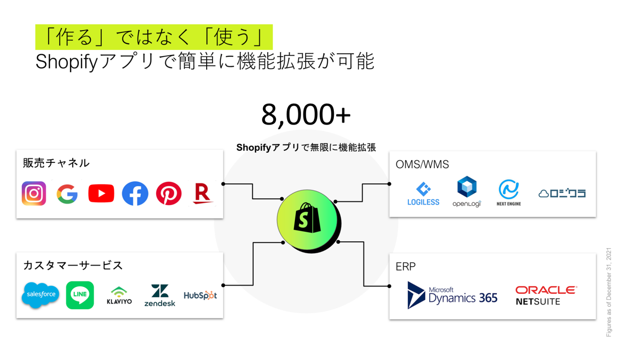Shopifyアプリには、販売チャネル、CS、OMS(注文管理システム)/WMS(在庫管理システム)、ERPなど、EC運用に必要となる代表的なサービスやプラットフォームを網羅しています。これらと連携し、つなぎ込んでいくことにより、簡単に無限に拡張していける、そういった軽やかさや柔軟性がShopifyの強みだと思っています。これらを活用することで、スモールスタートから、必要に応じて容易に拡張していくことができます。