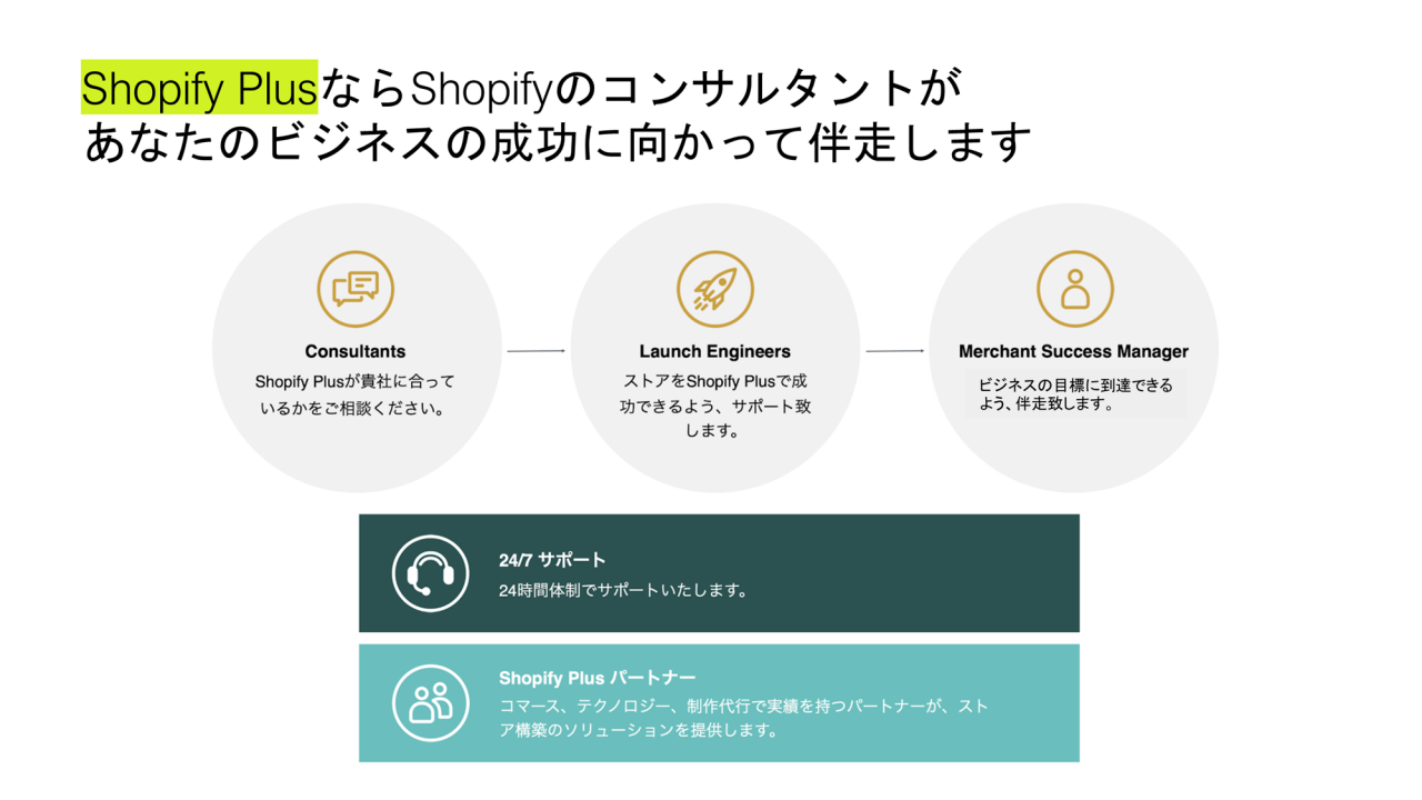 Shopifyでは、流通量が多い事業者またはより高度にカスタマイズされたストアを求める事業者を対象とした最上位プランとして提供するShopify Plusにおいて、経験豊富なコンサルタントがビジネスの成功に向かって伴走することが可能です。