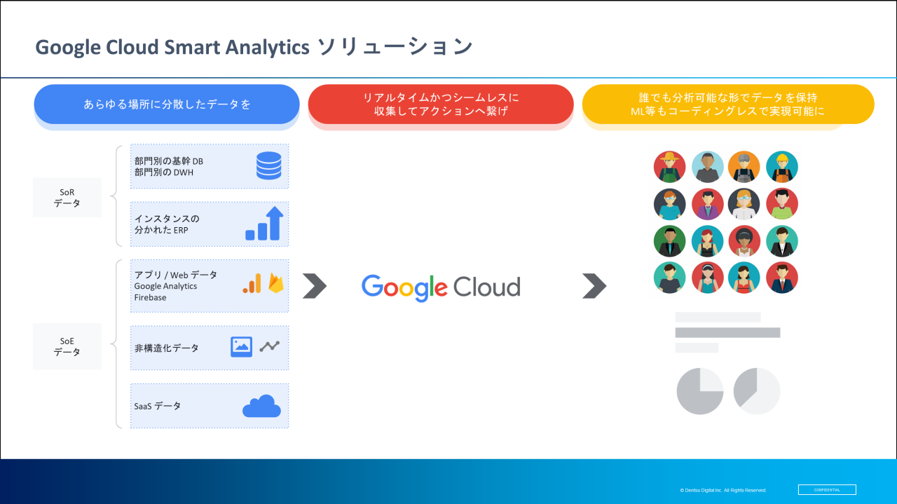 Google Cloudでは、こうした課題を解決するために、「Google Cloud Smart Analytics」ソリューションを提供しています。データ量と分析時のコンピューティングリソースに応じた従量課金制で、スピーディに利用開始できるため、スモールスタートが可能です。