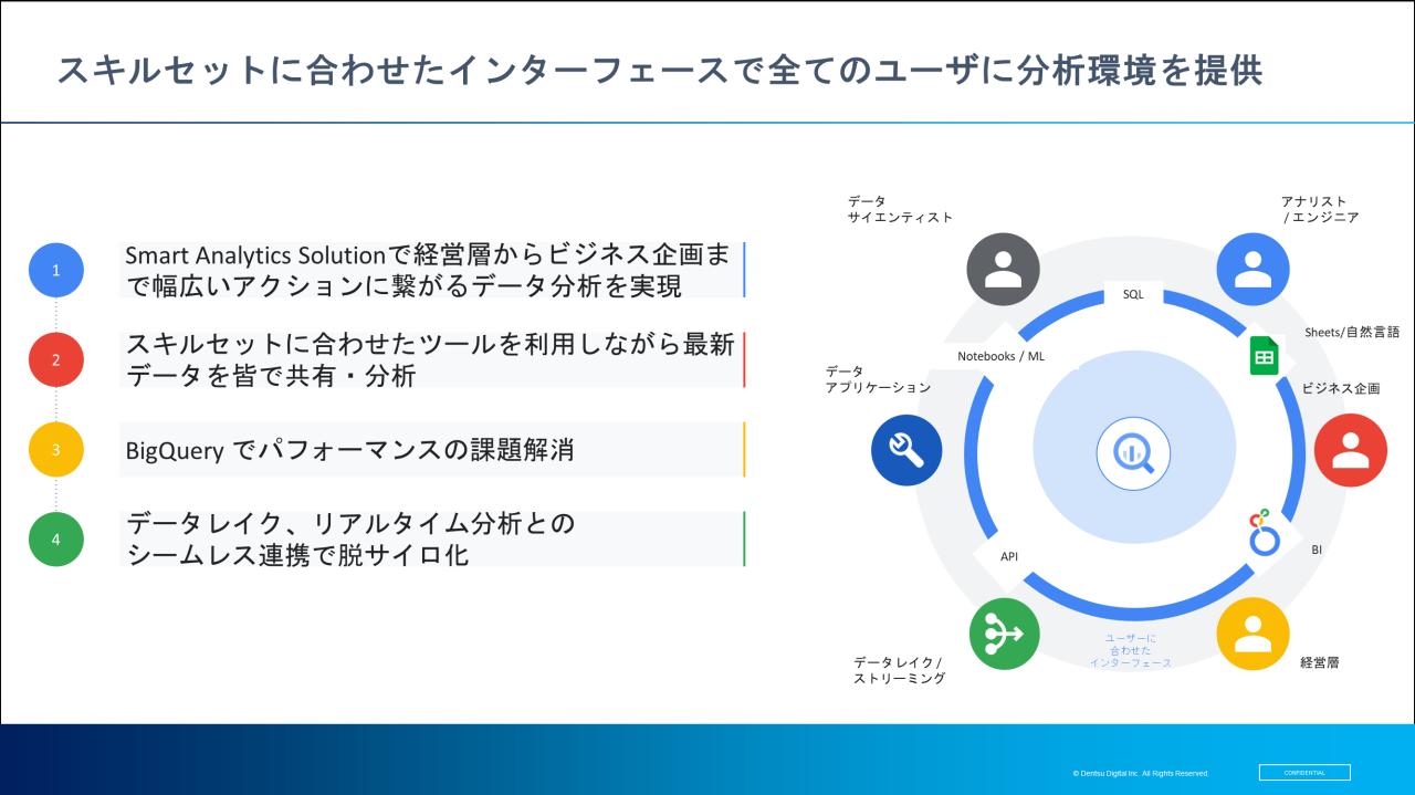 一方、データを扱うユーザーのスキルセットはバラバラです。こうした問題に対しても、データを1カ所に統合管理しておけば、ユーザーそれぞれのスキルセットに合わせたツールを使うことができます。