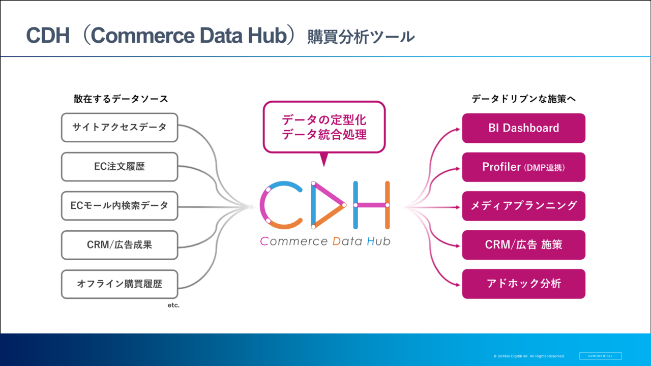 電通デジタルでは、「Commerce Data Hub」という購買分析ツールを独自開発しました。これは、EC関連の各種データソースを定型化し、統合処理を行うツールです。そして、その先の施策へつなげるためのレポーティングも行えます。