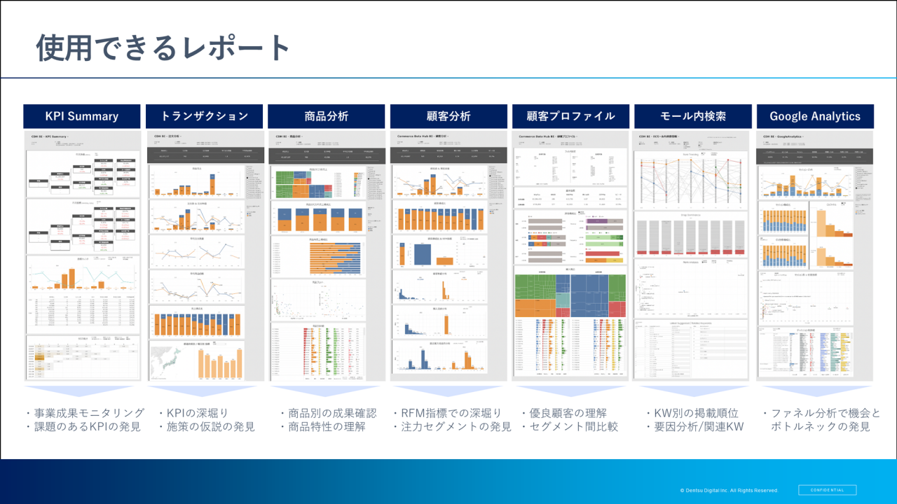 使用可能なレポートとしては、KPI Summaryやトランザクション、商品分析、顧客分析などが用意されています。