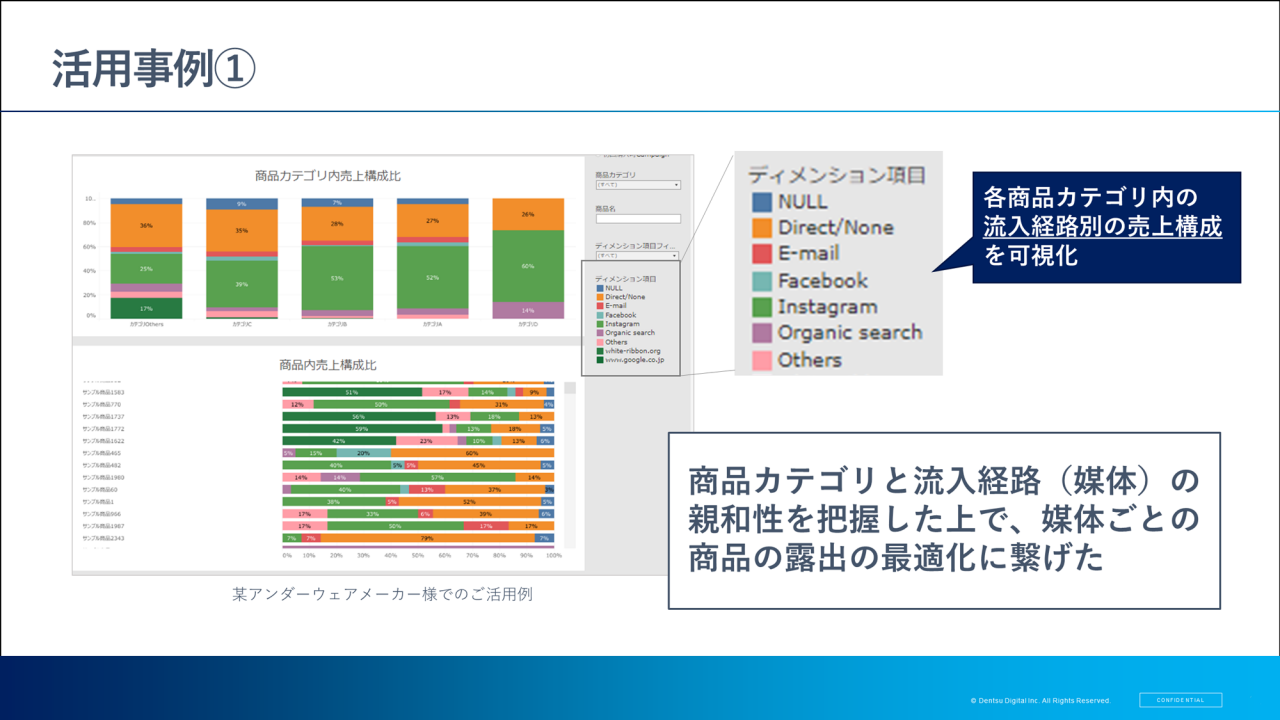 Commerce Data Hubの1つ目の活用事例は、商品カテゴリー別の売上構成比のレポートです。例えば、メルマガやSNSなどのように、流入経路別の売上構成比を可視化することが可能です。これにより、商品や商品カテゴリーと、その流入経路の親和性を把握した上で、各媒体の商品の露出の最適化につなげることができます。さらに、もっともLTVが高くなるような「ゴールデンルート」を導く示唆を得ることも可能です。