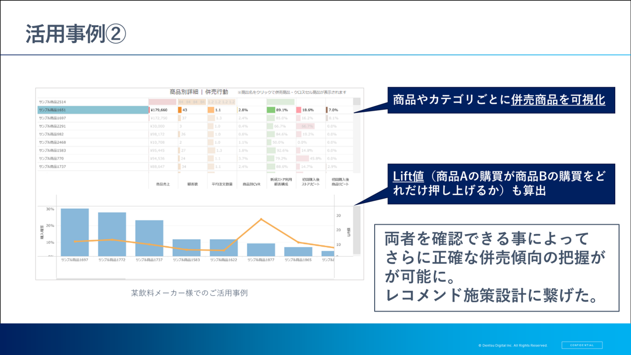 例えば、商品やカテゴリーごとに併売商品を可視化し、Lift値を算出することで、正確な併売傾向が把握できるようになります。その先には、レコメンド施策設計につなげることも可能です。