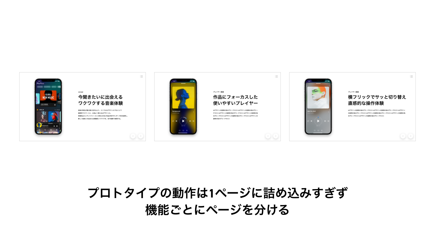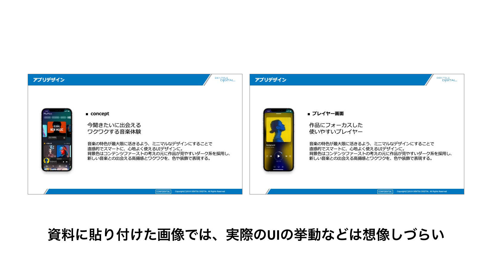 ゆえにUIデザインのプレゼンテーションは、そのデザインを通じて、体験させたいことや伝えたいメッセージを聞き手に伝えられるように工夫しなければなりません。