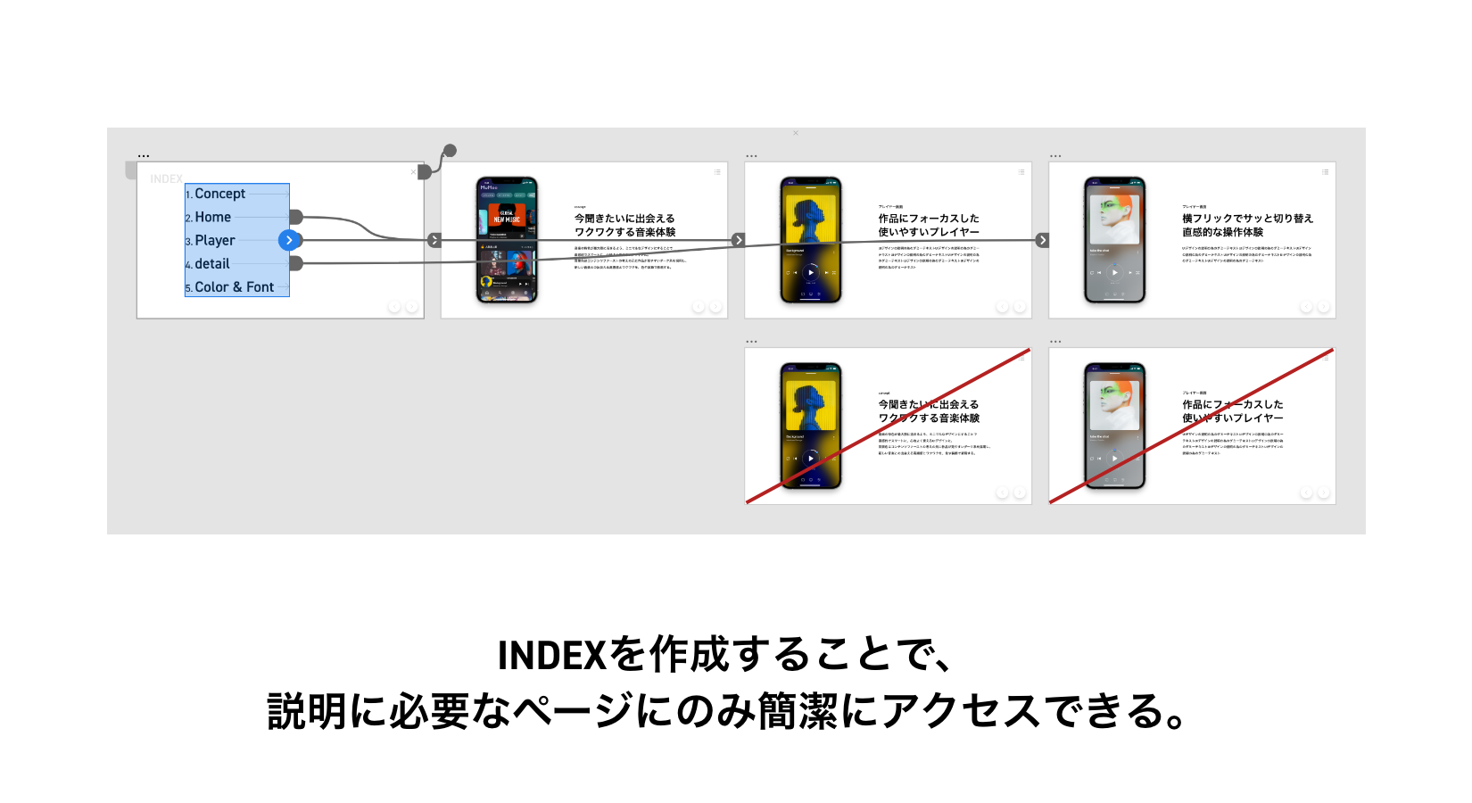 プロトタイプを作成する仕様上、アニメーションとして動かす用のアートボードができてしまうことが多いので、INDEXはプレビューの機能のもの使用せず、INDEX用のページを作成して、必要なページのみをリンクさせるようにしましょう。