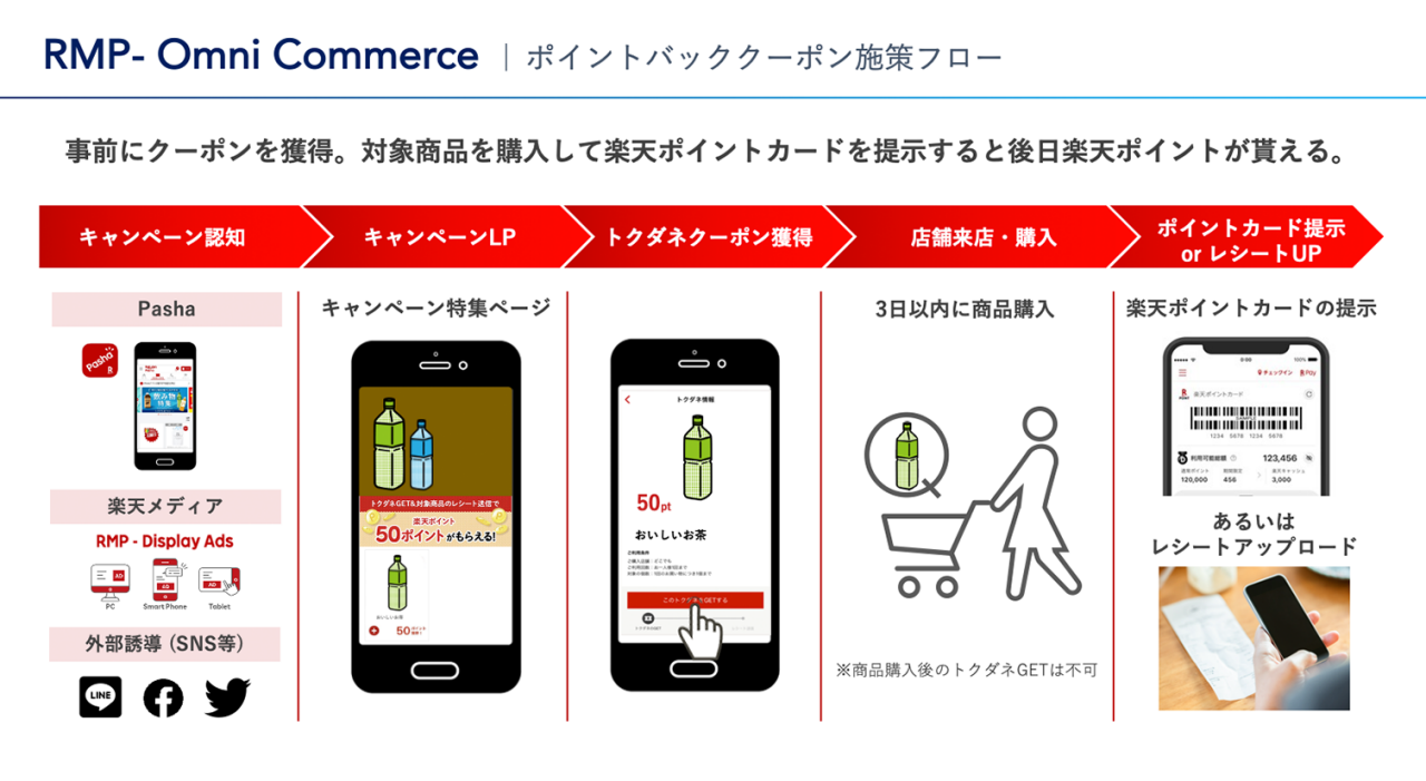 藤田 : 広告をクリックしたユーザーは、「Rakuten Pasha」内に設置されたLP(ランディングページ)に遷移し、「ディアナチュラ」の「トクダネ」(日替わりのデジタルポイントバッククーポン)を取得します。その後、オフライン店舗で「ディアナチュラ」を購入して、そのレシートを撮影し、「Rakuten Pasha」に送信もしくは、対象店舗では購入時に「楽天ポイントカード」または「楽天ポイントカード」機能が搭載されたアプリを提示していただくと、後日「楽天ポイント」が付与されるという仕組みです。