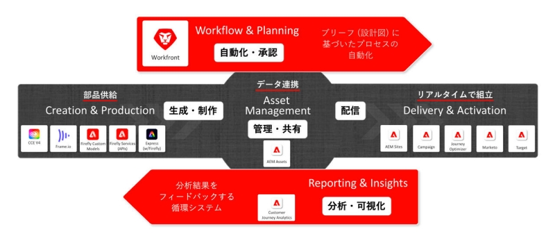 WorkfrontやAEMなど基盤ツールの導入から着手し、GenStudioのパフォーマンス機能なども試験適用。段階的にトライアルを重ねることで確かな手ごたえを得た部分から順次実運用に移行する、という形で取り組みを進めています。そこで得られたノウハウや知見を今後クライアントへの導入に生かしていきます。