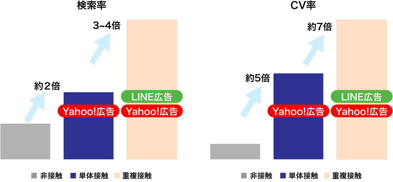 また、Yahoo! JAPANが検索媒体でもあることから、どのユーザーが検索行動に寄与したかの分析もできます。たとえば、最も検索しており相乗効果が出ているのは両方の広告に接触しているユーザーである、といった検証が可能です。