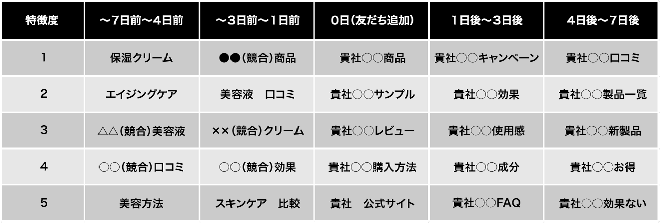 これにより、友だち追加したユーザーがその前後でどのような検索キーワードを使用していたかを時系列で追跡可能になり、どのような思考プロセスを経て友だち追加に至ったか把握できます。「このユーザーはこのような悩みを抱え、こういった検索を行った結果、この企業にたどり着いた」という一連の流れを時系列で理解できるでしょう。また、LINE公式アカウントからのメッセージに反応するユーザー層の特性分析も可能です。