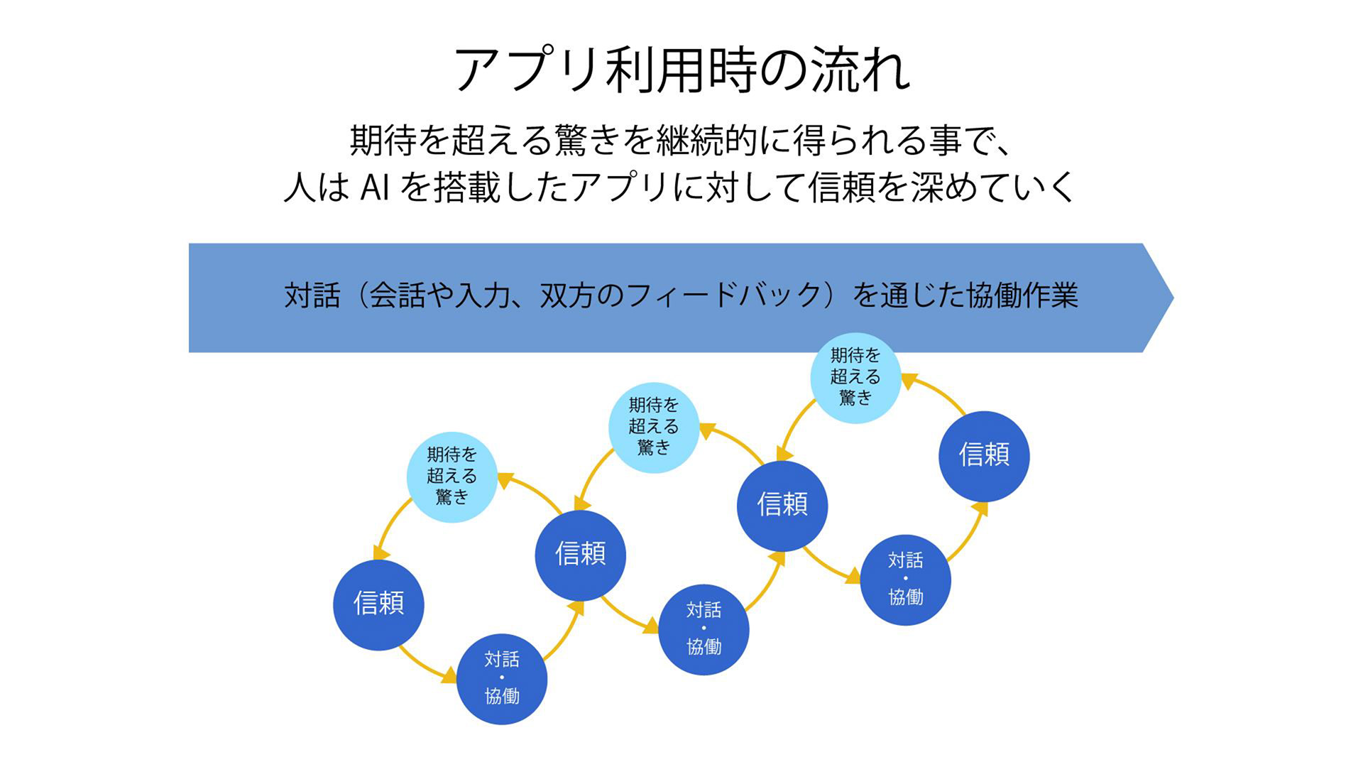 吉田裕志:タイムラインに沿った設計は難しくなると思います。これからは、ユーザーの行動に対してAIがどんな反応を返すか、その結果ユーザーがどう感じるか――このやりとりの積み重ねが重要になります。そして、どのような設計ならユーザーが信頼して使い続けるかが鍵になるでしょう。この設計の基盤にあるのは、AIとの協働です。ユーザーの発信に対してAIが適切に反応・適応・誘導し、ニーズを的確に捉える。その一連の流れを、ユーザーの期待を超える形で繰り返すことで「驚き」が「信頼」に変わり、アプリへの信頼が強化されていきます。AI搭載アプリを成功させるには、この「期待を超える驚きのループ」をつくることが不可欠だと考えています。