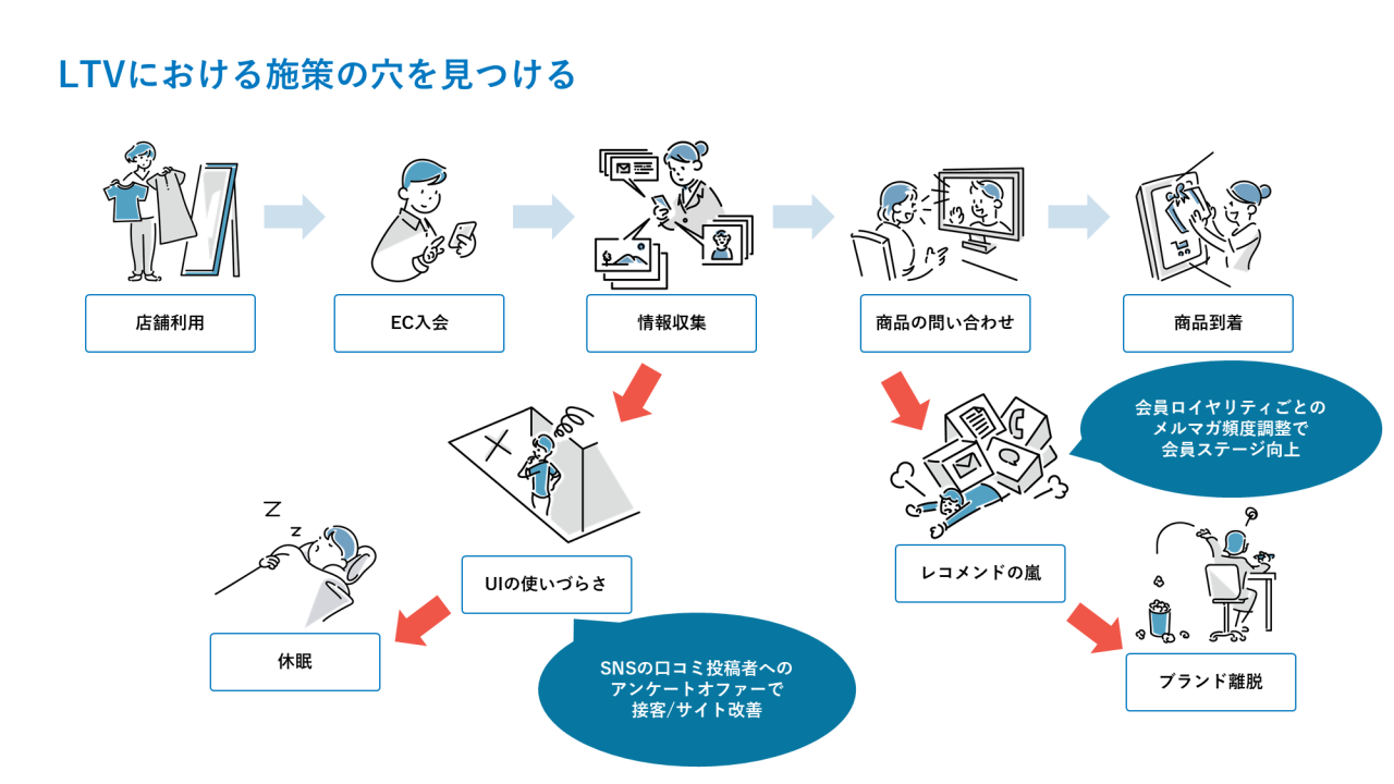 塚本 : LTV向上のためには、日常のあらゆる面で「ブランドから大事に扱われている」と顧客が感じるようなコミュニケーション設計が欠かせません。コミュニケーションのどこかに「このブランドは自分のことを分かってくれていないな」と感じるポイントがあると、顧客はブランドから離れ、最終的にはLTVの低下を招きます。このポイントのことを、"LTVの穴"と呼びます。