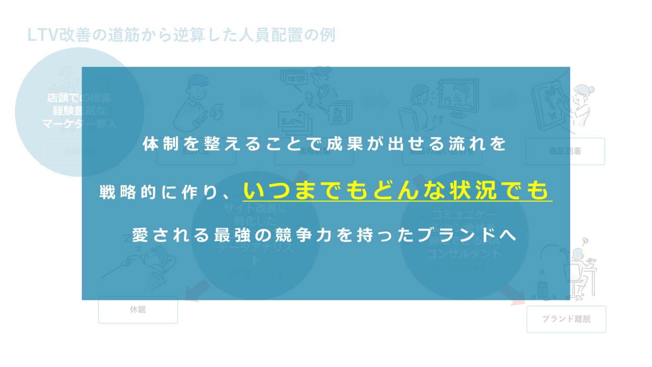 人員配置で最も重要なのは、体制を整えることで成果が出せる流れを戦略的に作ることです。どのような変化にも負けず、いつまでも愛される最強のブランドを育てるため、皆様と並走していくことができれば、私としては何よりの喜びです。