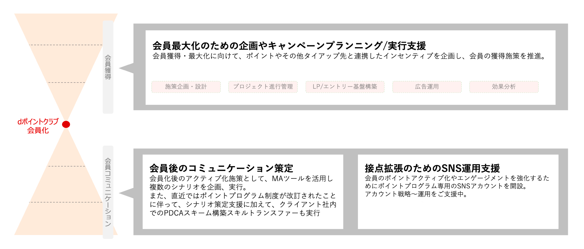 川原:NTTドコモ様は、長く通信事業をメインに行ってきた企業ですが、「dポイントクラブ」というポイント事業を中心に、回線契約ユーザーはもちろんのこと、回線契約ユーザー以外の方との接点も拡大していくことに取り組まれていました。これまでリアル店舗でのお客様とのコミュニケーションノウハウは溜まっていたものの、dポイントの会員拡大に向けたデジタル上のマーケティングやコミュニケーションをどうしていくかという点に、課題をお持ちでした。