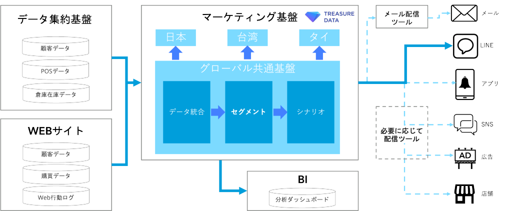 鳥居:もともと広告宣伝に関して電通グループには継続的に支援いただいており、クリエイティブ開発や来店効果の計測など様々な場面で連携していました。Treasure Data CDPを選んだ理由は、使いやすさと拡張性、そして既に海外展開の実績があった点です。