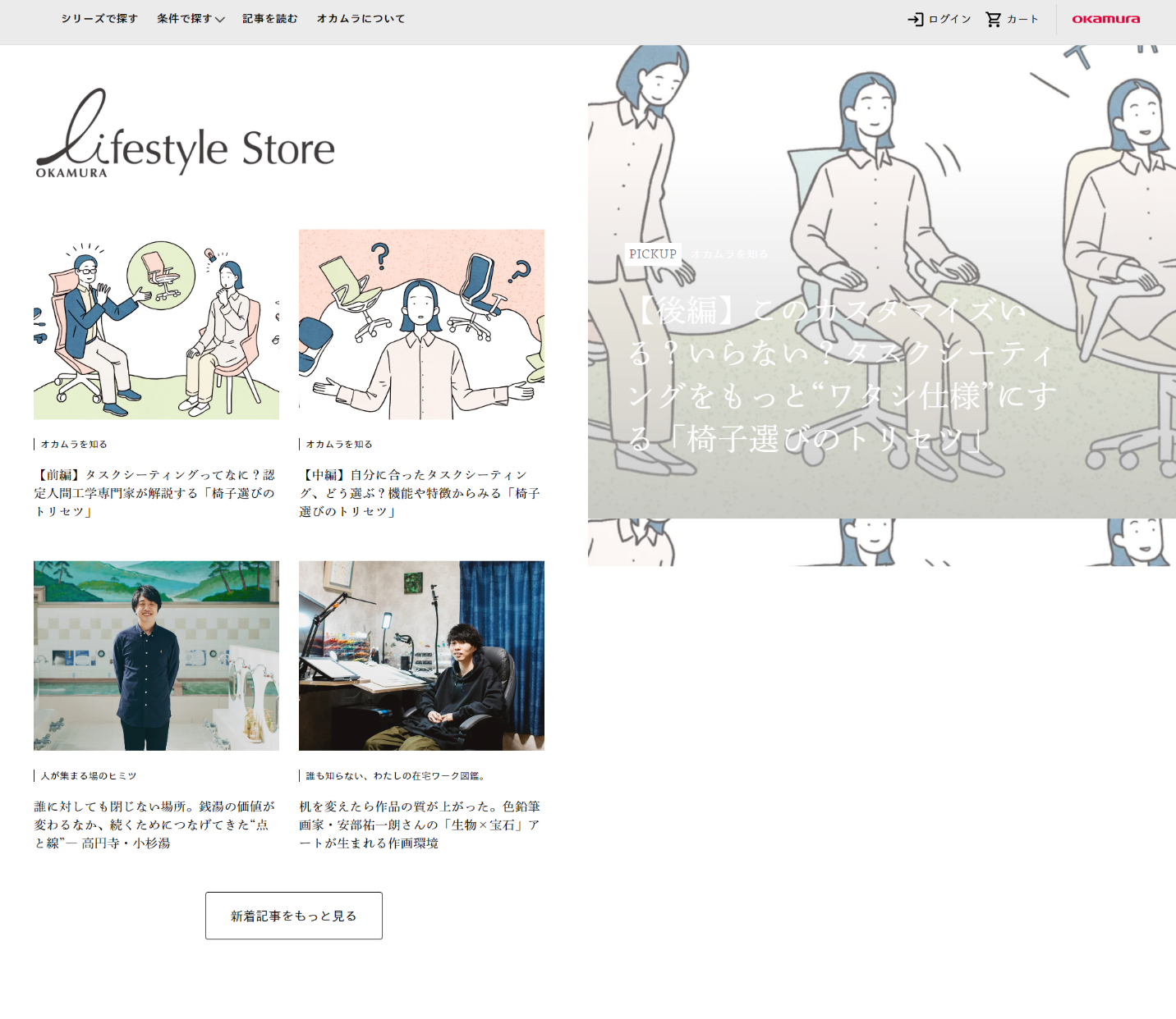 大きな特徴は、コンテンツ群が一番目立つところに掲載されているところです。ここがオカムラ様の今回のこだわりである「まずは知ってもらい、ファンになってもらいたい」という気持ちの現れで、一般的なECサイトとは少し違うところかなと思います。