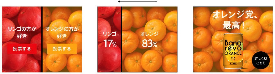 「バナーレボリューション」では、独自に複数パターンの表現のテンプレートを開発することで、ダイナミッククリエーティブバナーをこれまでよりもスピーディーかつ低コストで制作することが可能になります。具体的には、閲覧する時間帯等の情報に合わせて表現が変化するバナーや、インタラクティブに反応するバナー、商品の人気投票ができるバナー、リアルタイムで情報を更新できるバナー等、11種類のテンプレートを用意しました。