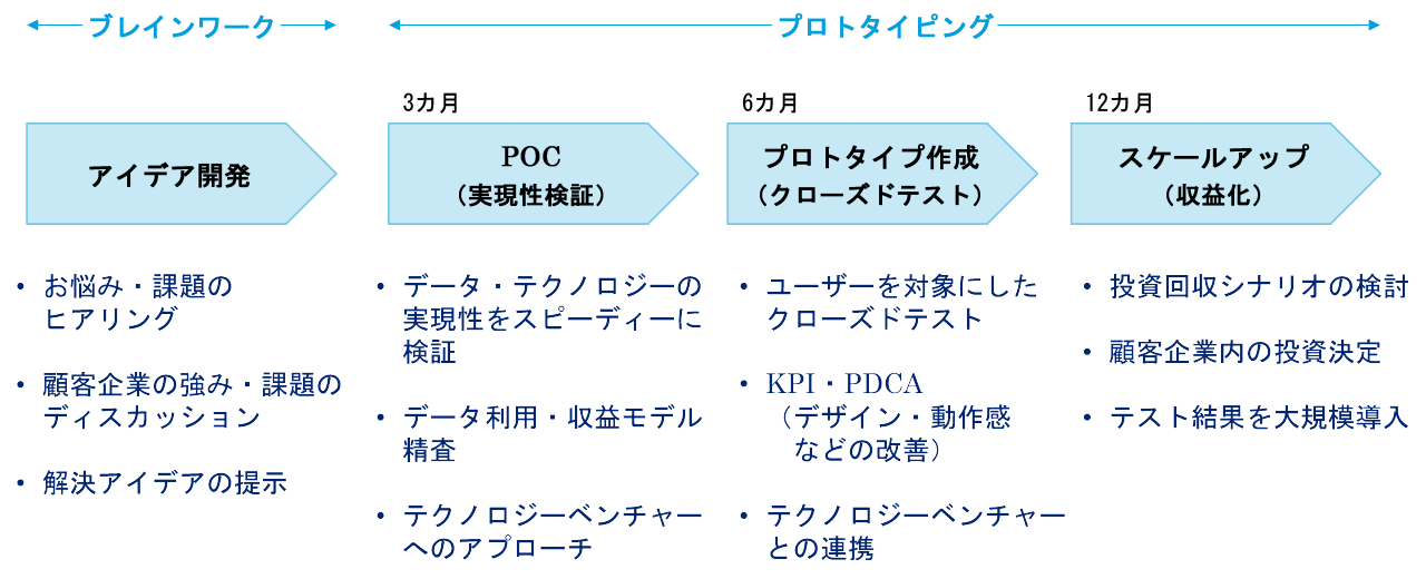 AIやIoT(モノのインターネット)などテクノロジーの急速な進展とライフスタイルの多様化で、ますます将来を予想することが難しく、十分に時間をかけて新規事業・サービスを開発することが時代や社会に合わなくなってきています。そこで注目されているのが、プロトタイピングと呼ばれる手法です。新規事業・サービスにつながる試作品の開発をスピーディーにかつ低コストで行い、市場でテストすることにより開発の失敗リスクを低減するものです。しかし多くの企業では、自社内でテクノロジーとマーケティング/ビジネスを横断的に考えることのできる人材が不足しており、また外部に相談する際はテクノロジーベンチャーの乱立で、どこにまとめて相談したらいいのかよく分からないという声も聞かれます。