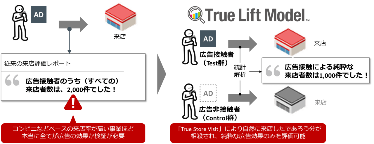 これまでデジタル広告による来店計測は、広告に接触した人のうち、店舗に来訪した人の数すべてを広告効果としてカウントすることが一般的でした。こうした従来の計測手法の場合、特に流通業や外食産業において、習慣的な来店のため「広告と接触しなくても自然に来店したであろう人」が数多く含まれてしまい、デジタル広告による来訪効果が過大に評価されてしまうという課題があり、その数値を広告効果のKPIとして設定することはできませんでした。
