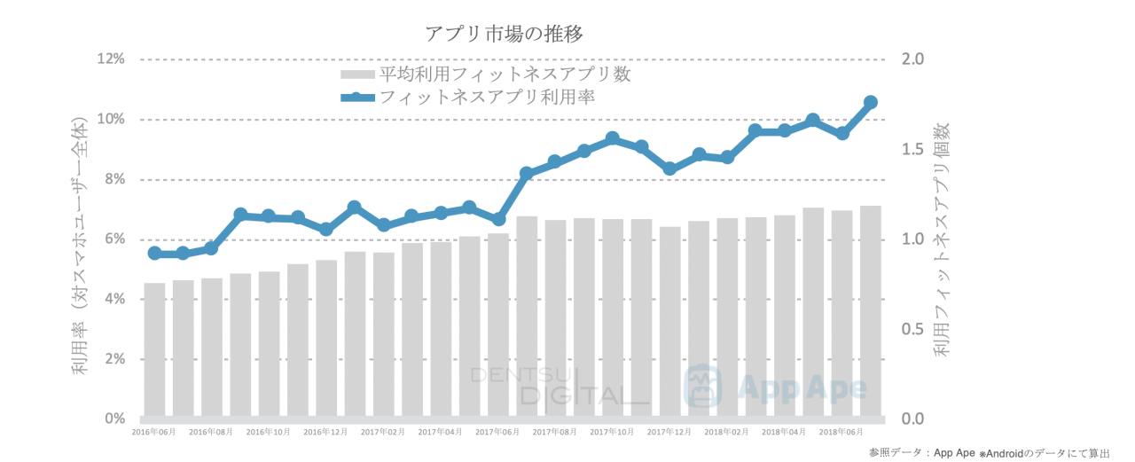 国内のモバイル・アプリ利用者のうちヘルスケア&フィットネスアプリ利用率は5%から10%へ2倍上昇。今後も成長産業