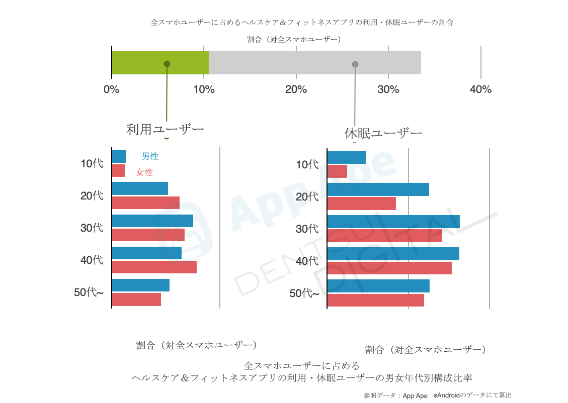 フィットネスアプリは、休眠ユーザーを含めると全体の33%が利用していることが分かりました。その内、49%が男性、51%が女性と男女比率は約半々の割合となり、30~40代の割合が最も高いことも分かりました。