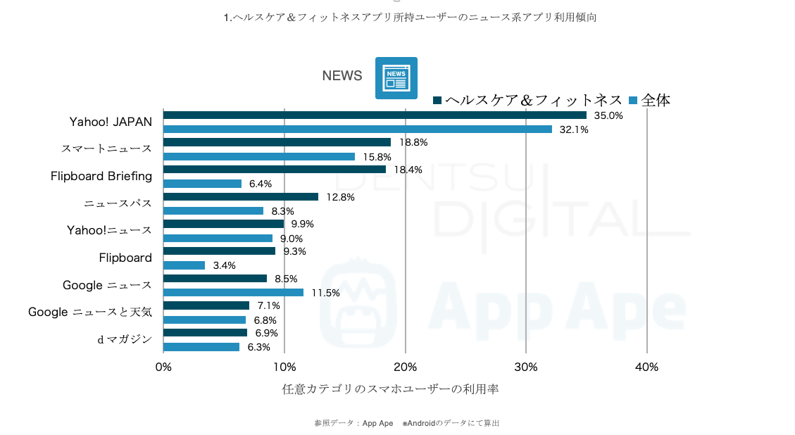 ヘルスケア・フィットネスアプリ所持ユーザーが 最もよく使うニュース系アプリは「Yahoo! JAPAN」で35.0%が利用。続いて「スマートニュース」が18.8%、「Flipboard Briefing」が18.4%という結果になりました。