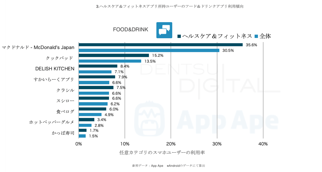 ヘルスケア・フィットネスアプリ所持ユーザーが最もよく使うFOOD&DRINK系アプリは「マクドナルド」が35.6%。続いて「クックパッド」が15.2%、「DELISH KITCHEN」が8.4%という結果になりました。