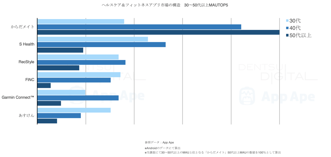 なお、本調査は一部となりますが、全調査結果はレポート「ヘルスケア&フィットネスアプリ市場調査レポート」にて提供しています。レポートでは市場全体の動向に加え、主要ヘルスケア・フィットネスアプリの性年代別比率などを紹介しています。レポートは、下記の特設ページから無料でダウンロードが可能です。
