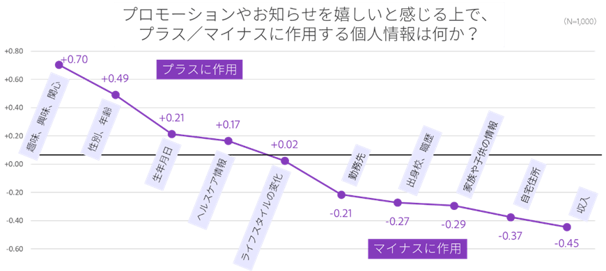 例えば、情報の参照元であるSNSの公開情報 (-0.27) で、個人情報の家族や子供の情報 (-0.29) を参照されることには抵抗が強いものの、受け取るタイミングが購入日や会員登録から何周年というような節目であり (+0.22)、受け取る方法はSNS広告 (+0.05) で、その内容がセールなどの催事案内 (+0.74) を受け取れば、合計 +0.45 となり、消費者にとってポジティブなデジタル体験になり得るとの結果となりました。
