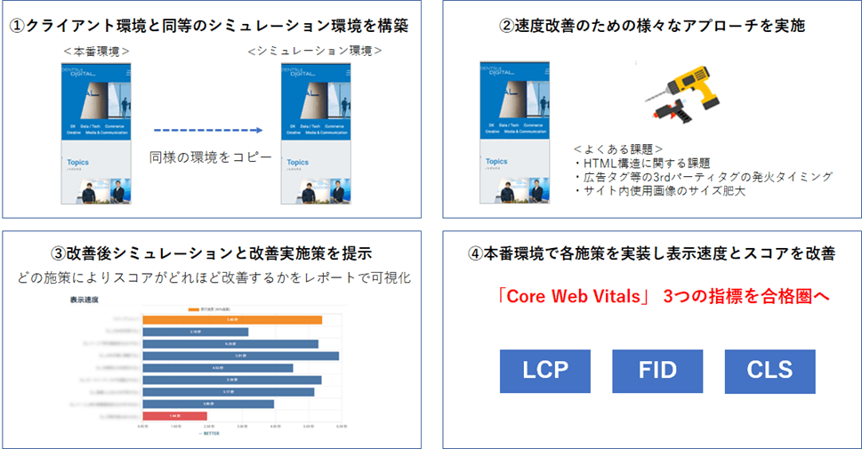 本サービスは、対象Webサイトのコピー環境を構築し、「Core Web Vitals」や、同じくGoogle のページ速度計測ツール「PageSpeed Insights」に基づく現状スコアを測定。そのコピー環境において「HTMLやJavaScript改修」「3rdパーティタグの最適化」といった施策によるスコア改善の検証を繰り返すことで、最も効果の高い施策案を導出します。その改善後スコアを可視化したレポートも提供することで、企業の本番環境における改修施策実施の合理的な意思決定を可能とします。その施策をもとに、実行、検証、改善までの支援も行い、企業はWebサイトの表示速度の効果最大化を実現し「Core Web Vitals」の評価を高めることができます。
