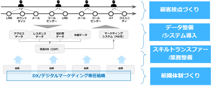 さらには、デジタル化が進む中で、企業は「顧客にモノを売る」から「顧客にモノやサービスを使い続けてもらう」マーケティング活動へとシフトする必要が出てきています。単なる購買データだけではなく日々のサービスの利用状況など顧客インサイトを把握するためのデータ分析をもとに高価値のサービスを提供する次世代型の「カスタマーサクセス志向のデジタル活用」が重要となっており、このような顧客サービスを組織として実行することが求められています。