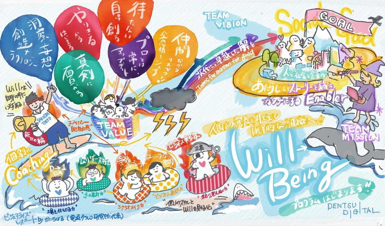 こうした状況において、電通デジタルは、これまでのDX支援における豊富な実績と経験から、企業のビジョンやパーパスと整合した「チームのゴールの設定」と、「チームに属する一人ひとりの意志(Will)の引き出し」が持続的、自律的なチーム作りのための成功の鍵であり、個人はもちろん、その集合体であるチーム・企業それぞれが「Will-Being(意志ある存在)」であることが、変革しつづける組織においてより重要性を増すと考えています。